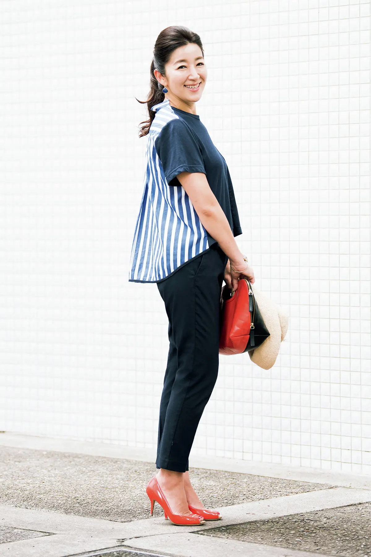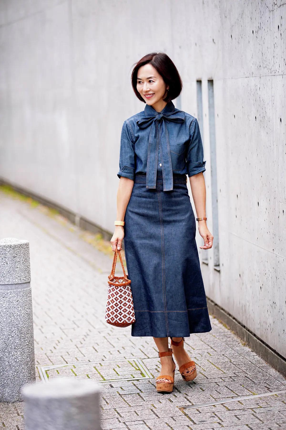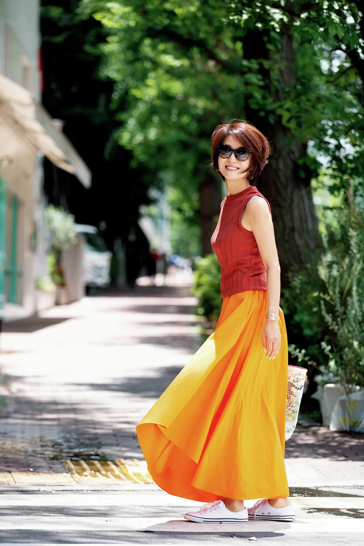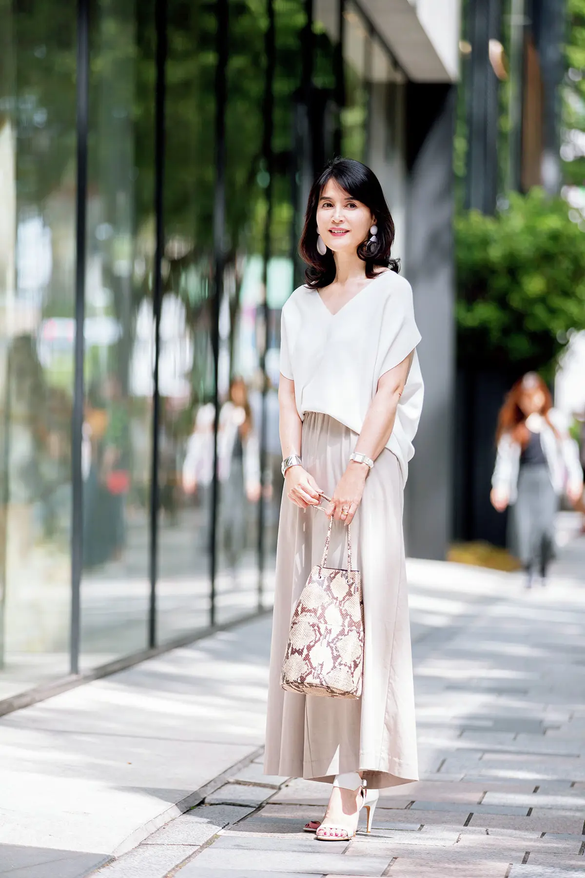 éclatラグジュアリー ここでは身近なエクラ世代の日本の女性たちをスナップ! 流行と自分らしさを組み合わせた、進化しつづける着こなしを紹介。暑さが厳しい日々でも涼しくてきれい見えする着こなしが目立った! 1.今までの固定観念を捨てた新しいおしゃれに積極的 鈴木たま江さん(エクラ華組・ポーセラーツ教室主宰)オフの日は太陽の日射しを浴びながら大好きなショッピングを楽しむ鈴木さん。「イレギュラーなすその揺れ方にひと目惚れしたスカートは、人生初挑戦のビタミンカラー。マキシ丈という面積の大きなオレンジ色も濃密色のニットと合わせればシックに着こなせました。足もとはスニーカーでハズして、プリントが楽しいトートをポイントにカジュアルにまとめました」。木漏れ日が降り注ぐ白金の街に、ビタミンカラーがよく似合って。 2.旬バランスのワントーン。涼しげなきれいめが好印象 有村一美さん(エクラ華組・主婦)「春には赤いスカートに挑戦。でも回り回ってまたベーシックカラーに落ち着きました」。大好きなグレージュのパンツはエブール。オーバーサイズのニットを前インしたら、パイソンのバッグやボリュームピアスで遊びを効かせて。 3.デニム素材をフェミニンに着るのが私流 朝生育代さん(エクラ華組・ナレーター)似合うスカートは膝丈と断言していた朝生さんがミディ丈に開眼。「マディソンブルーのデニムスカートは小柄な私でも着こなしやすく、ブラウスでセットアップ風に着られるのもお気に入り」。厚底サンダルでバランスも良好。 4.デザインと機能性に優れたトップスに頼る 林 美和子さん(会社経営)「仕事と育児で自分に時間がかけられない今は、デザイン性や形状記憶の機能に助けられています」。サカイのトップスとセオリーのパンツは大好きなネイビー。靴とバッグにオレンジをさすことで気持ちも前向きになれるそう。 5.リネンのサロペットで簡単コーデをアップデート 櫛部美佐子さん(カオス ディレクター)自身がデザインしたリネン素材のサロペットを休日は一枚で、ふだんは重ね着で愛用中。「合わせたTシャツはオリジナルで型くずれしにくい素材。きれいめに着こなせます」。アンティークとハイブランドのバングルを重ねづけして。 eclat9月号掲載 撮影/大瀬智和 中澤真央 取材・文/向井真樹 magazine magazine 2026年2.3月号 最新号試し読み 定期購読 デジタル版 購入 shopping shopping エクラプレミアム通販 売れ筋ランキング エクラ掲載品 エクラ限定アイテム イーバイエクラ follow us #50代 #eclat五選 #エクラ華組