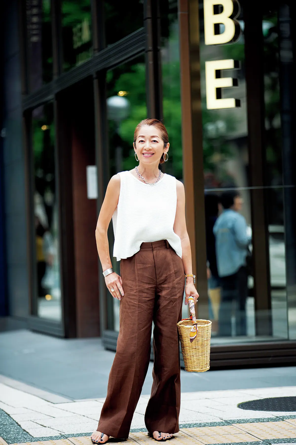 éclatラグジュアリー Jマダム、この夏はなにを着てる? ここでは身近なエクラ世代の日本の女性たちをスナップ! 流行と自分らしさを組み合わせた、進化しつづける着こなしを紹介。すぐに使える、等身大のおしゃれヒントが満載! 1.オンもオフも、スカートやワンピースを満喫 寺谷真由美さん (ビューティサロン代表取締役副社長)「胸もとのフリルやネイビーに白の涼しげなプリントと、好みのツボが凝縮。私には1サイズ大きいのですが、ゆとりのあるシルエットが着たくて店員さんの意見を押しきって買いました(笑)。ひと目惚れです」。自宅のテラスに友人を招いてBBQを楽しむ寺谷さんにとって、お招き服はこだわりどころ。「派手すぎず地味でもなく、みんなと一緒にその場を楽しめる一枚です」。 2.ギンガムのふんわりブラウスで体型カバー 本郷智香子さん(自営業)大人が着られるギンガムチェックトップスは、本郷さんとクウムとのコラボアイテム。「首もとのあきを控えたぶん、後ろをV字にあけて抜け感を。タック入りのふんわりシルエットはスカートにも」。モノトーンが涼しげ。 3.黒を重ねたクールカジュアルを実践 新宅淳子さん(エッセン.ロートレアモン デザイナー) 仕事柄、トレンドに対してニュートラル。そして私服はどんどんシンプルに。「メンズライクでオーセンティックな服が好き。ライダースとパンツはエッセン。レザー、コットン、サマーウールと素材違いで黒を取り入れます」 4.日焼け肌に似合う天然素材のシンプルシック 中道有香さん(サロン経営)イタリアンマダムのように日焼けした肌もファッションの一部という中道さん。「海辺での暮らしには色を抑えた飾らない着こなしで。シンプルなのでシルバージュエリーとオレンジのスカーフ使いをポイントに」。 5.決め手はきれいとカジュアルのバランス 山田明子さん(自営業)サラッとしたナイロン素材のパッカブルジャケットは、山田さんとダブルスタンダードクロージングとのコラボ服。「Tシャツとデニムをきれいめに着たい日にジャケットは便利。足もとにはヒールが欠かせません」。 eclat9月号掲載 撮影/大瀬智和 中澤真央 取材・文/向井真樹 magazine magazine 2026年2.3月号 最新号試し読み 定期購読 デジタル版 購入 shopping shopping エクラプレミアム通販 売れ筋ランキング エクラ掲載品 エクラ限定アイテム イーバイエクラ follow us #50代 #eclat五選