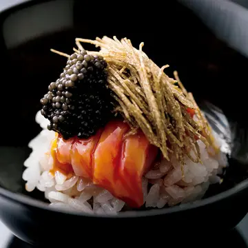 サーロインと熟成感のある秋トリュフ、キャビアがのる贅沢な飯蒸し。黄身醤油で味わうオリジナル料理