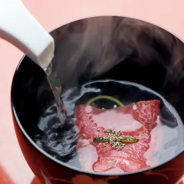 花街の風情を色濃く残す、祇園の路地にひっそり暖簾(のれん)を掲げて11年。新鮮な肉のうま味に魅了された伊藤力さんが、その感動を体験してもらいたくてこの店をオープン。餌にこだわって32カ月以上肥育した神戸牛や、近江牛をさらに食べごろまで熟成し、試作を重ねた創作肉料理を月替わりのコース仕立てにしている。料理によって部位を変え、ヒレ、ロース、テール、タンなどの7~8種類を使用。向付や椀物、お凌(しの)ぎなどを経て、しゃぶしゃぶ、最後に好みの銘柄と部位のステーキがドンと登場する。「肉がメインですが、組み合わせる旬の食材で四季折々の味を楽しんでもらいたい」と伊藤さん。肉を引き立てるワインもそろえ、祇園ならではの華やかな和の風情も満喫できる。
