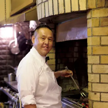 四十余年使っている煉瓦窯で極上神戸牛を炙り焼きにする2代目の美安さん。炙りながら煙をまとわせ、香りとともに表面を焼き上げていく究極のステーキ