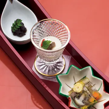 そぼろ煮、季節のゼリー寄せ、野菜のムースの前菜と、牛肉に、だし汁を注ぐ「肉すまし」は、椀に肉のうま味が広がる逸品。う~おいしい~!