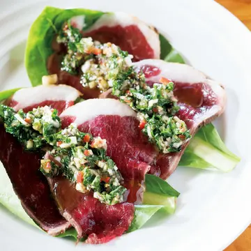 羊のカルパッチョ。野菜の香味と酸味がきいたソースで