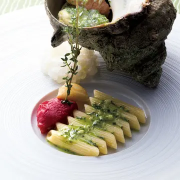 伊勢のサザエは通常のものよりひと回りも大きい。パセリバターでフレンチ風に。貝の中に残ったソースをパスタにかけるアイデアに脱帽