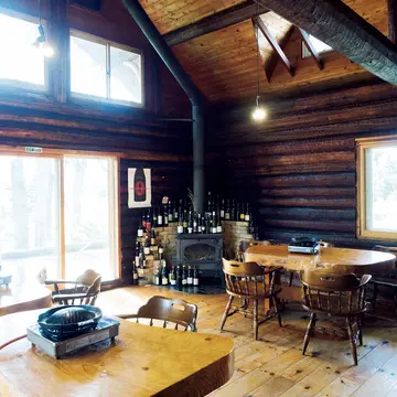 天井が高く、窓が広くとられたログハウス。外の景色や風のすがすがしさも楽しみながらの食事は格別