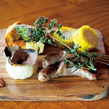 羊と富並豚のソーセージと前菜の盛り合わせ。自家菜園で収穫したじゃがいもを熟成させて作るフライドポテトも隠れた名物