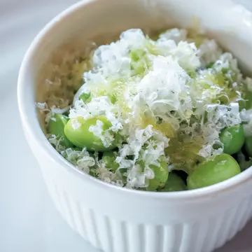 イタリア料理の定番"そら豆とペコリーノチーズ" をアレンジした、枝豆ペコリーノ。料理はすべてコース(¥3,500~¥7,000)の一例