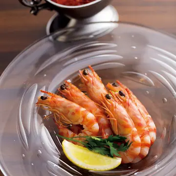 生きたエビをボイルした、前菜のエビのカクテル・チリソース