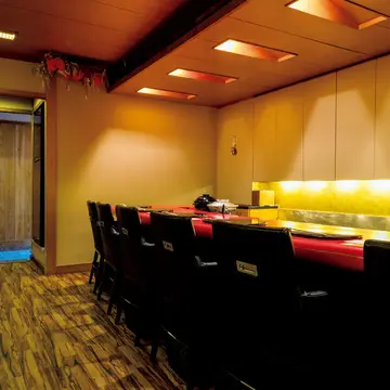 派手な看板はなく、店内も木を基調にした落ち着いた雰囲気。オープンキッチンのカウンターとテーブル、奥には個室もあり、隠れ家のような造り