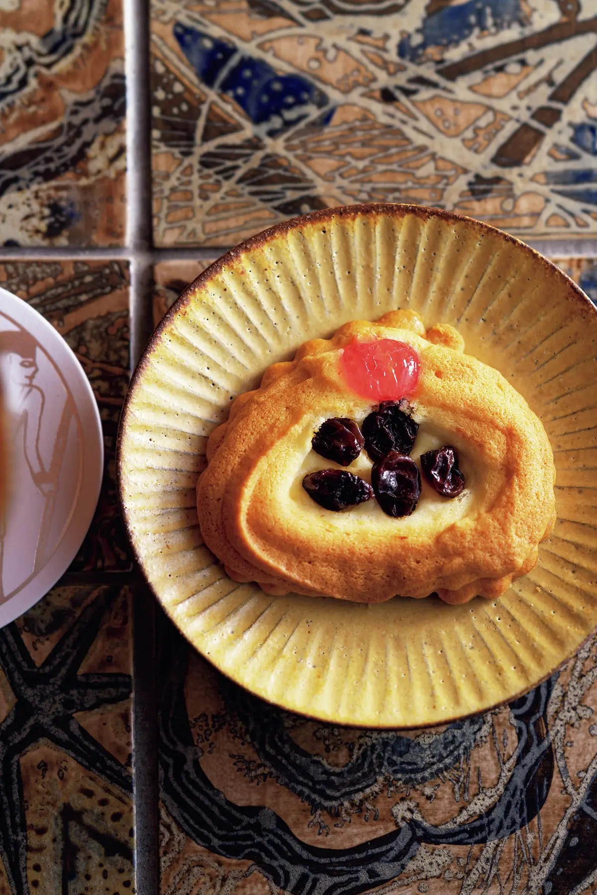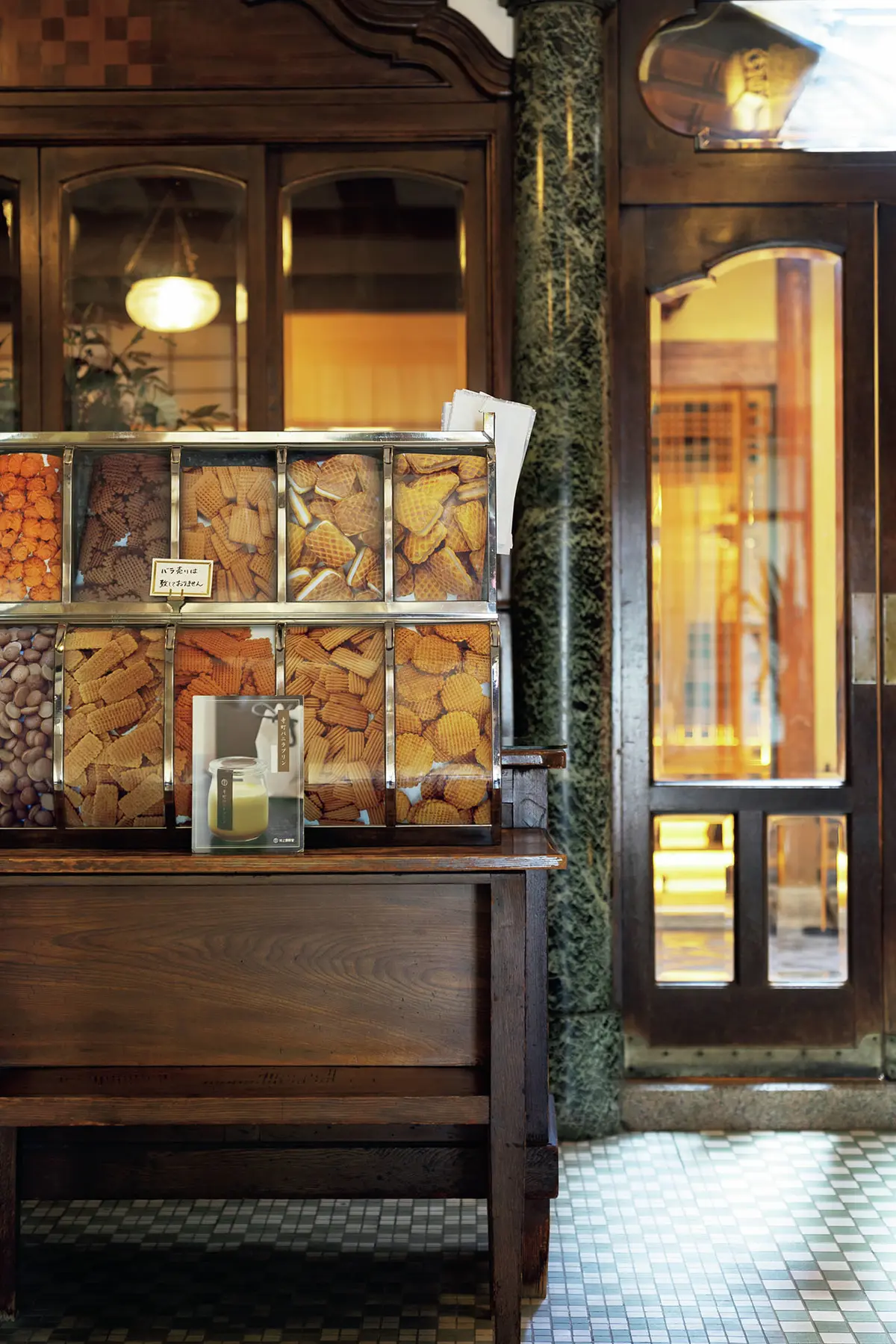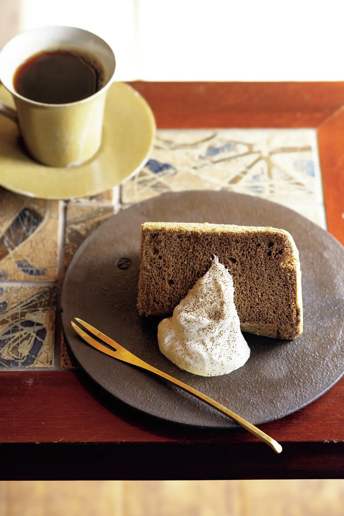 明治40年創業、京都で一番古い洋菓子店が、昨年、ショップ奥の母屋を改装し、カフェをオープン。外観や販売スペースはノスタルジックな洋館風ながら、カフェは靴を脱いで上がる純和風の建築で、そのギャップも楽しい。カフェ内は北欧のヴィンテージ家具がゆったり配され、庭を望む窓向きのひとり席も居心地抜群だ。店で販売されているのは、繁忙期には数カ月待ちとなるクッキーの詰め合わせをはじめ、明治や大正から作り続けられている菓子がほとんどだが、カフェでは新作スイーツも。「いつもシフォンケーキとコーヒーをいただきます」(海出さん)。『一保堂茶舗』の極上ほうじ茶をパウダーにして生地に練り込んだシフォンケーキは、ふわふわ食感の中に香ばしさを感じる上品な味わいだ。