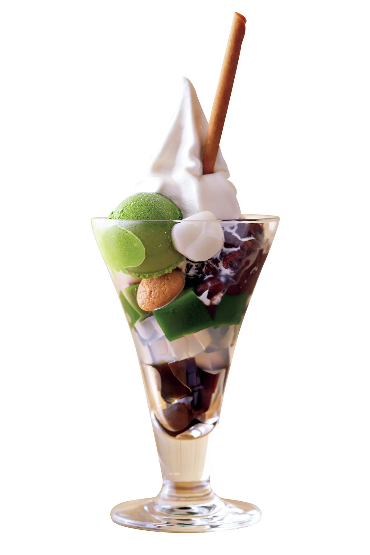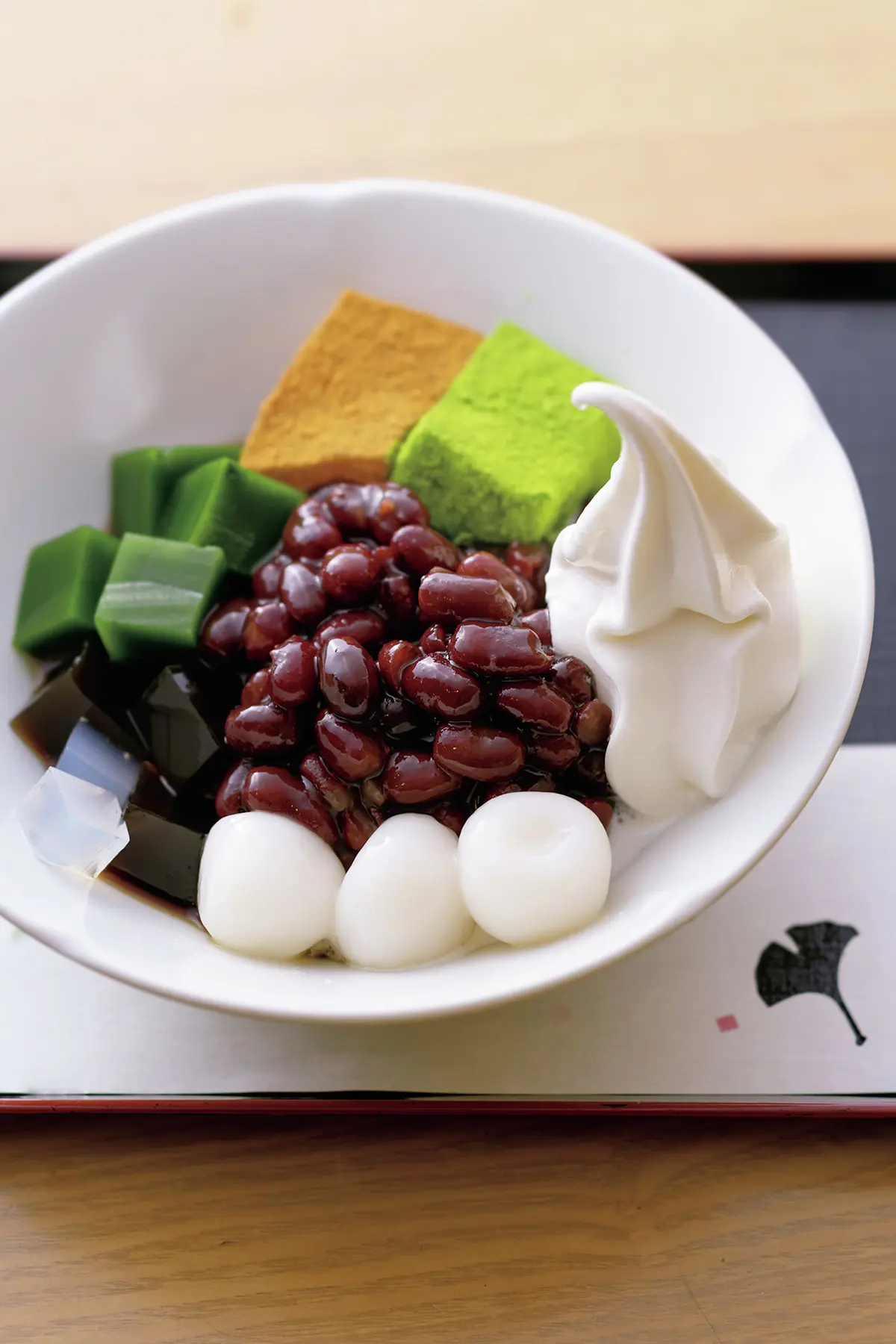 もともとは喫茶店だったのが、店主が手間ひまかけて作る甘味が人気を呼び、今や全国から甘党が訪れる店に。「この世で一番おいしいと思う甘味店です」(青山さん)。メニューに使うアイスクリームやゼリーも自家製にこだわり、特にあずきの炊き方が秀逸と評判だ。大きく粒がそろった丹波大納言を使用し、下ゆでしたあと、砂糖水にじっくり漬けてから火を入れることで、大粒でも煮くずれすることなく、中までしっかり味が入るとか。そうして炊き上がったあずきはしわがなく、ふっくらつやつやで、見ただけでおいしいとわかるほど。春のあまおうイチゴのあんみつや夏のすだちかき氷など、季節限定メニューも人気が高く、10月下旬から登場する丹波栗のパフェやぜんざいも今から待ち遠しい。