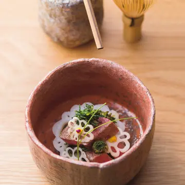 『京都吉兆』で10年、ニューヨークの精進料理店『Kajitsu』、ロンドンの日本料理店『UMU』で各3年勤務。10年後の自分への投資と考え、世界をめぐり、日本料理を俯瞰(ふかん)する目や感性を身につけた店主の西原理人さん。「"未完の美" という古く日本の文化で培われた感性に美意識を感じます。かぎりなく百に近い九十九に永遠や究極が存在すると思っています」。昨年12月に開店して以来、奈良の行事や風習をテーマに、独自のコースを月替わりで提供。11月は炉開きにちなみ、口切新茶と発酵茶葉のブレンドを大和牛に添えて楽茶碗に盛り、炊き合わせは大鉢に盛って絵柄の松を景色に見立て、自由な発想と大胆な表現がなされる。