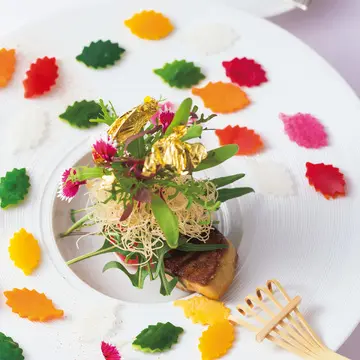 緑美しい景観、洗練の料理、アートを飾る空間をひとつの芸術として奏でるようにと名づけられたレストラン。伝統的なイタリア料理をベースに奈良の素材や文化からインスピレーションを受けたオリジナリティあふれる料理を供している。紅葉に見立てた野菜に小さな熊手を添えたフォワグラとトマトの前菜や大和野菜たっぷりの魚料理、秋を司る女神「龍田姫」の名がつくぶどうづくしのデザートなど、演出に富んだ姿で登場する。