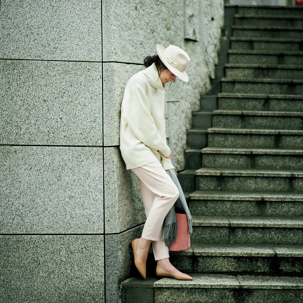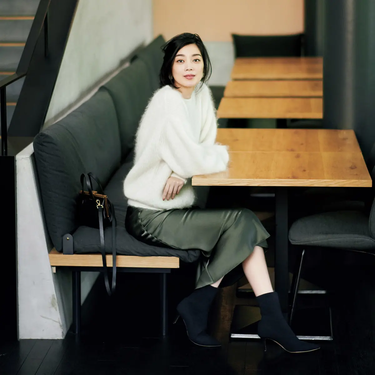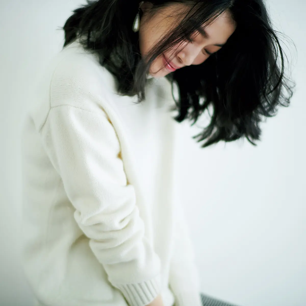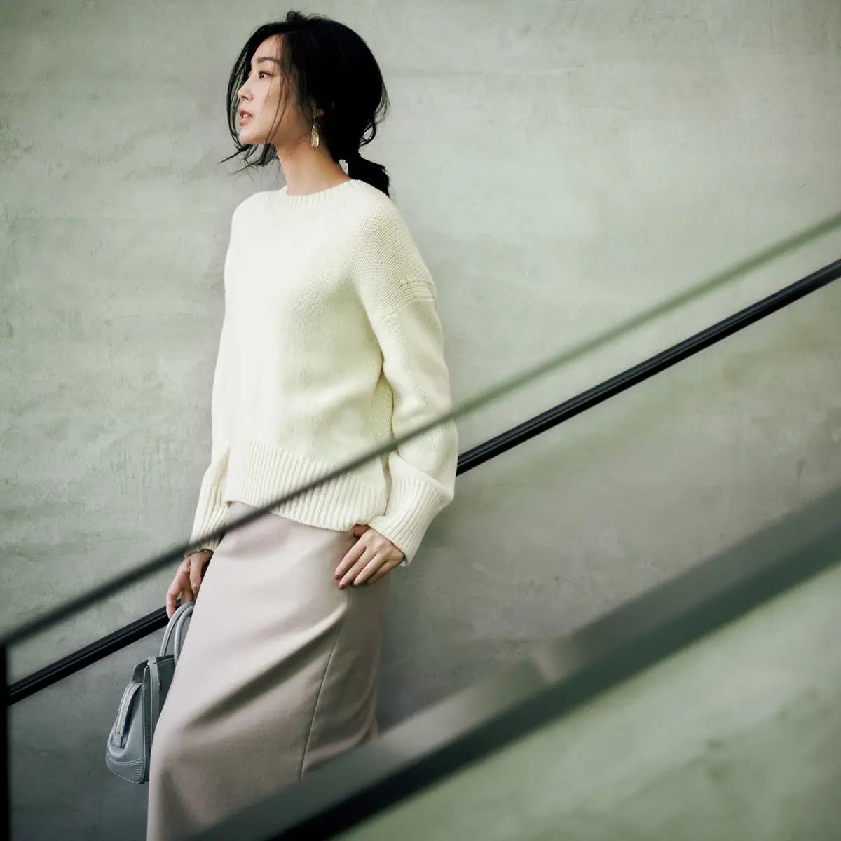 どんな色のアイテムも受け止めるベーシックカラーのよさと、女らしく軽やかに見せてくれる、いいとこどりな白ニット。ボディを包み込む、全体のルーズ感のあるものを選べば、今どき感を演出しつつ大人の体をきれいに見せてくれる。