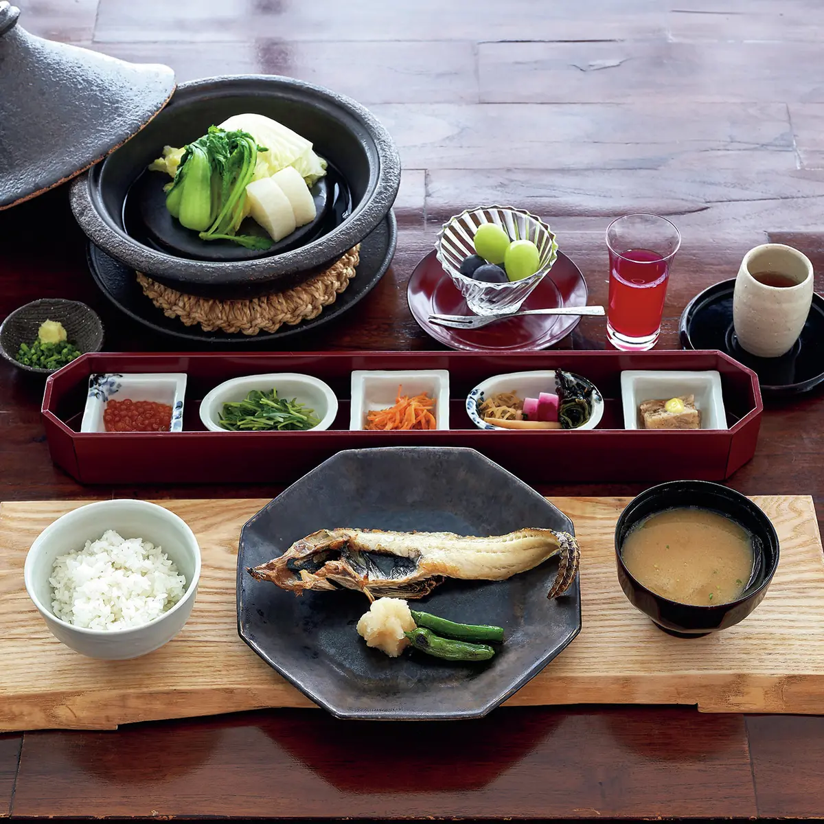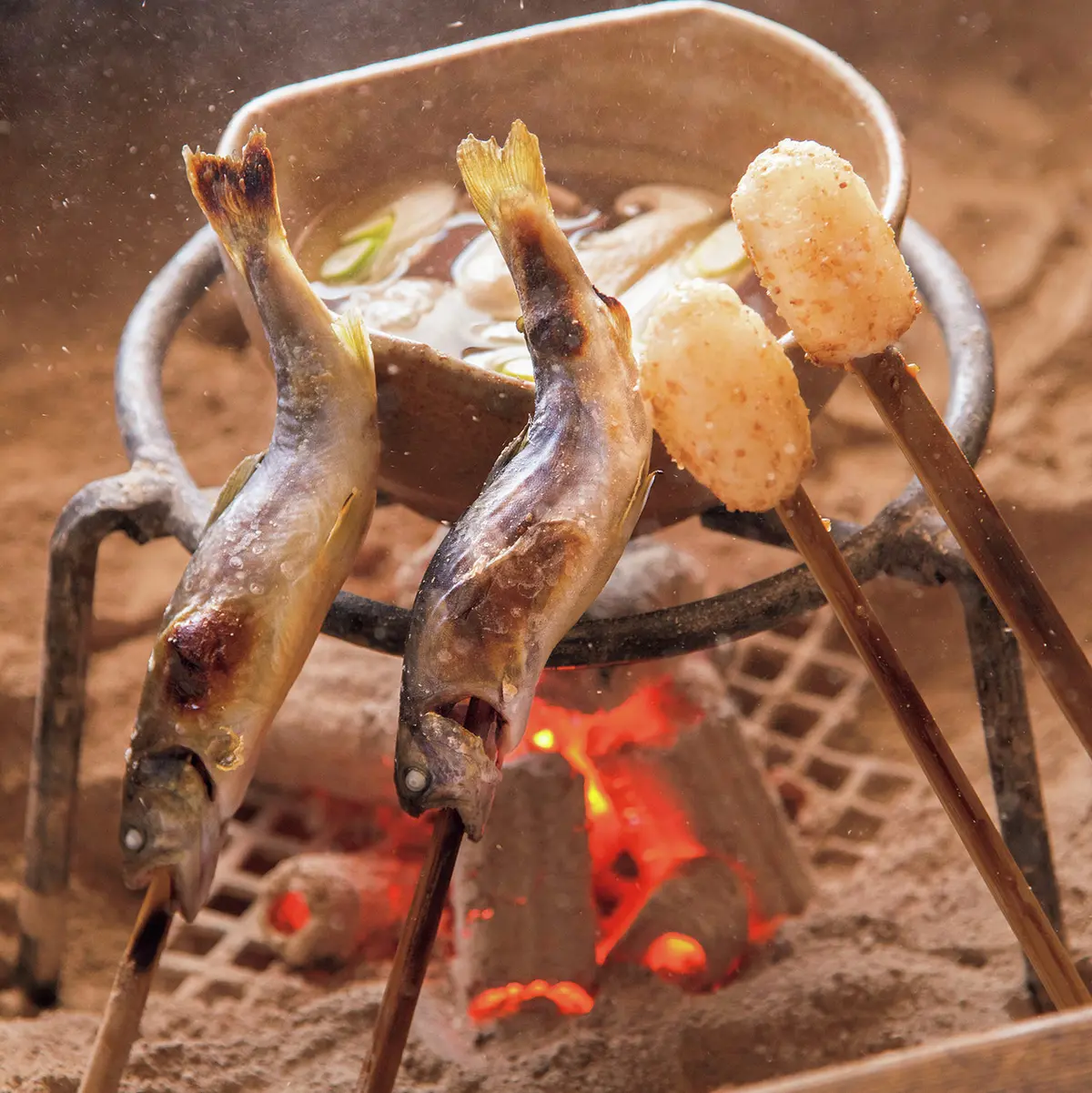そして期待高まる郷土ディナーは、囲炉裏を囲んで飛騨牛をはじめ地の恵みと季節の味に舌鼓。手間を惜しまず薪で炊き上げる香り高いごはんや、雪鱒のへぎ造り、岩魚の塩焼きなど、山里の恵みを心ゆくまで味わえる。翌朝は食後に囲炉裏のあるロビーでコーヒーを楽しんだり、
