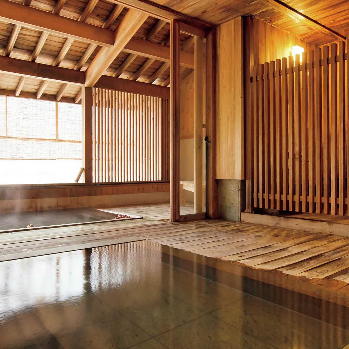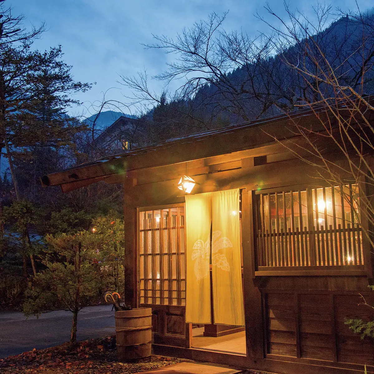ここは湯めぐりを堪能する宿。自家源泉の半露天大浴場と、福地温泉の共有源泉の3つの貸切露天風呂のほか、北アルプスを源流とする平湯川を望む野趣あふれる露天風呂「森の湯」などバラエティ豊か。昼間は雪化粧した奥飛騨の山々、夜は満天の星を眺め、最高の温泉タイムになりそう。川を渡る軽やかな風、鳥の声を楽しみながら心豊かに堪能したい。
