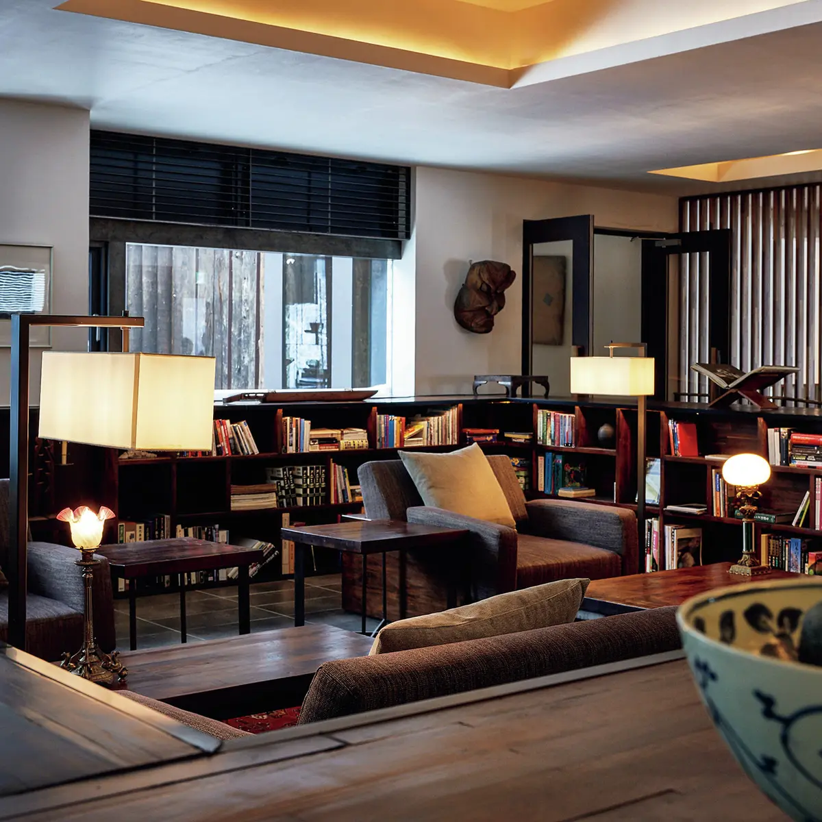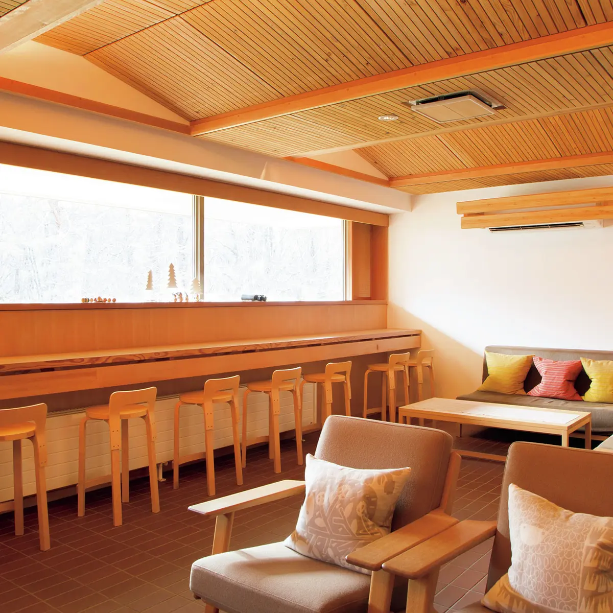 福島、山形、新潟の3県にまたがる自然豊かな磐梯朝日国立公園の一部、磐梯山の北側に広がる裏磐梯。そこにたたずむ『ホテリ・アアルト』は、住宅建築のもつ心地よさをふんだんに取り入れつつ、スケール感も備えたリゾートホテルだ。外見はいかにも山荘らしいたたずまいの大屋根。北欧邸宅のリビングルームのような1階ロビーには、北欧家具の名品があふれ、夜はくつろぎのバースペースに早変わりする。