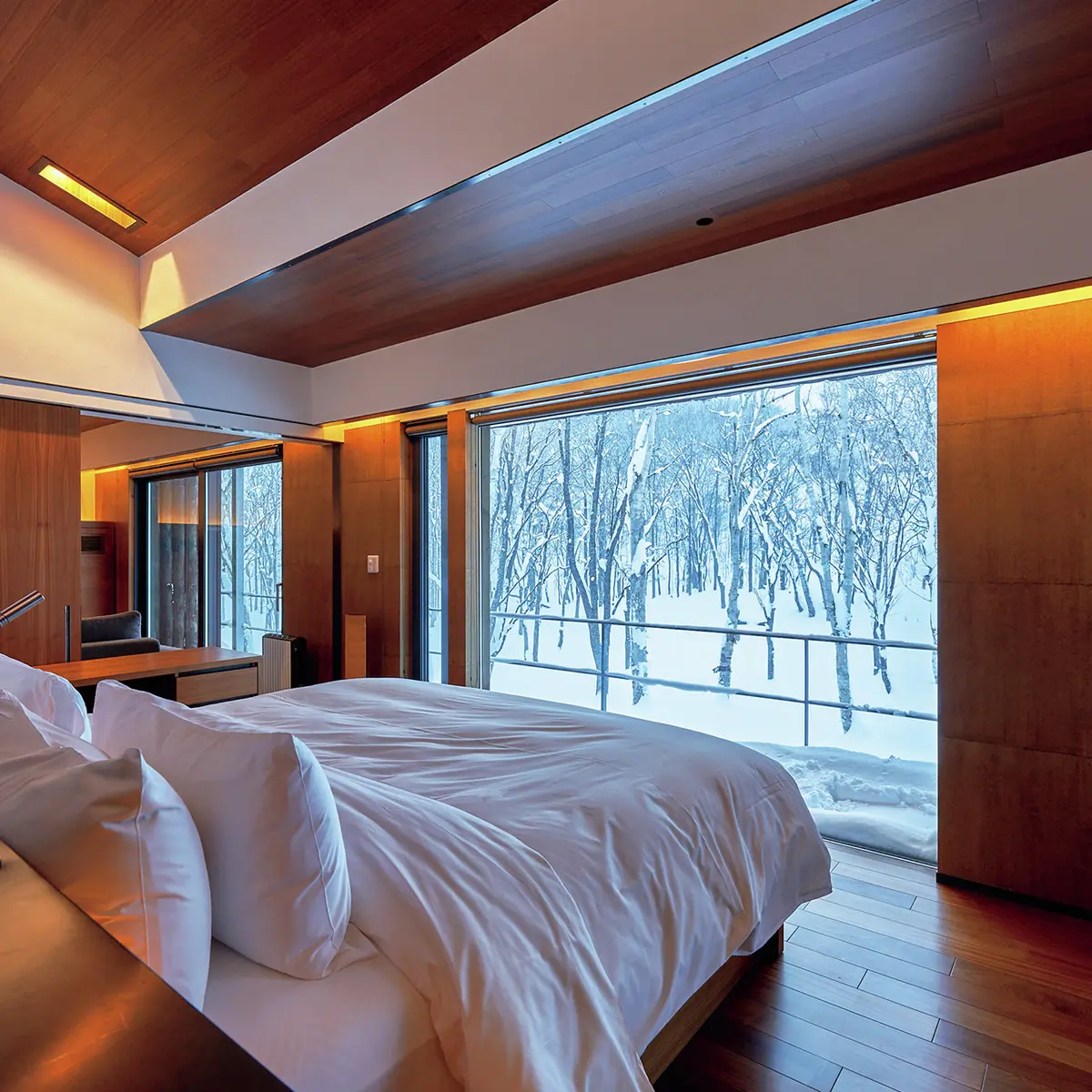 1万5000坪の敷地に、独立したヴィラタイプの客室がたった15室。部屋に入ると、天井までの広い窓いっぱいに、スノーホワイトが広がる。雪に覆われた白樺林や牧場が目の前。遠くには羊蹄山もしくはアンヌプリ、ワイスホルンが眺められ、自然と一体化した気分を味わえる。視界を遮る建物はいっさいない立地自体、贅沢そのものだ。