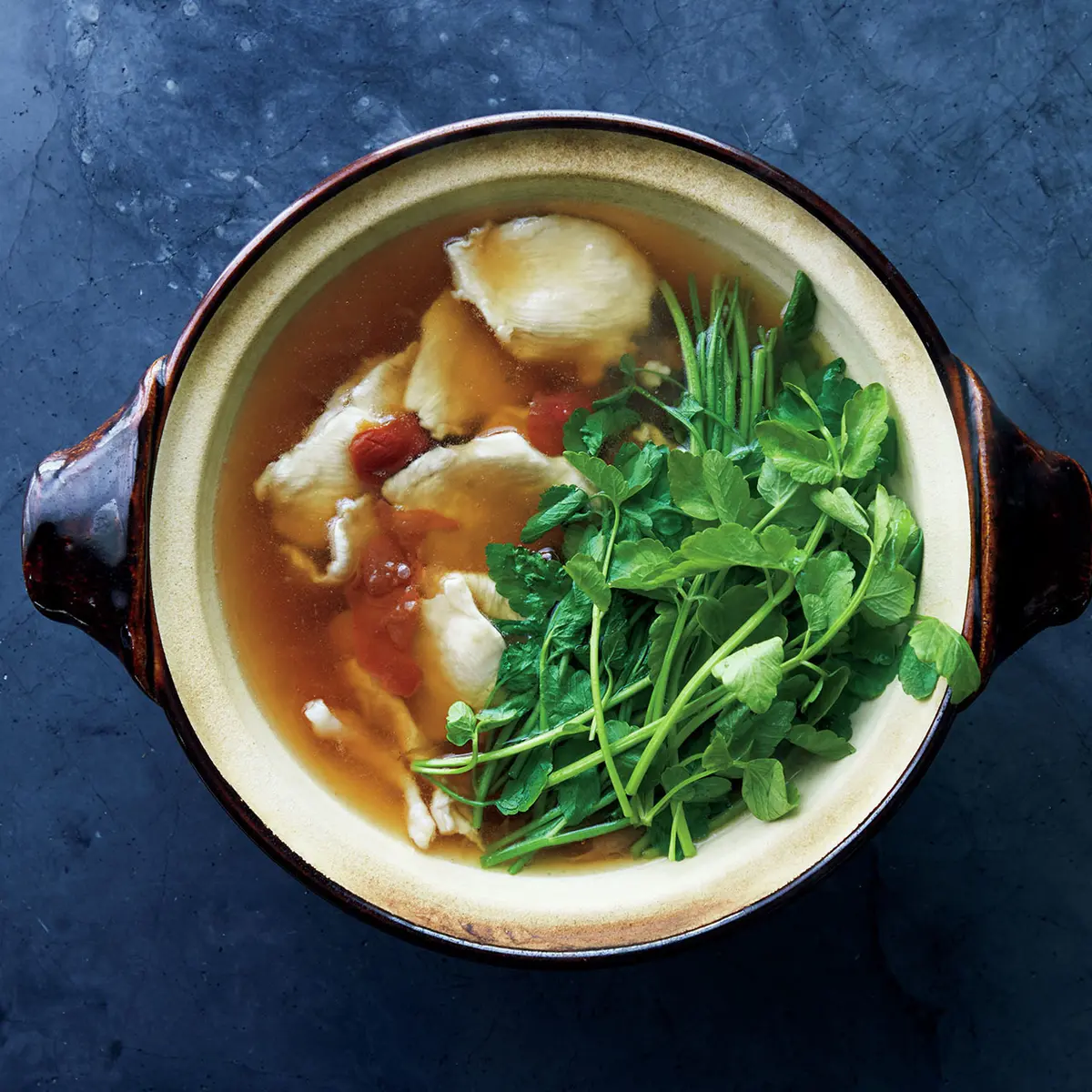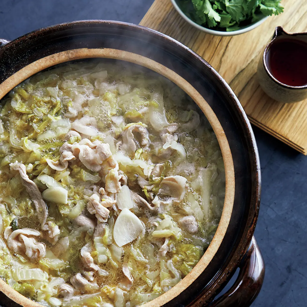 1. 台湾風 白菜すっぱ鍋 台湾で大人気の酸菜白肉鍋をアレンジ。くたっと煮えた白菜と豚肉のうま味に、香菜の香りと黒酢の酸味がぴったり!