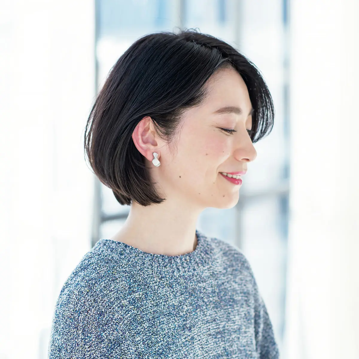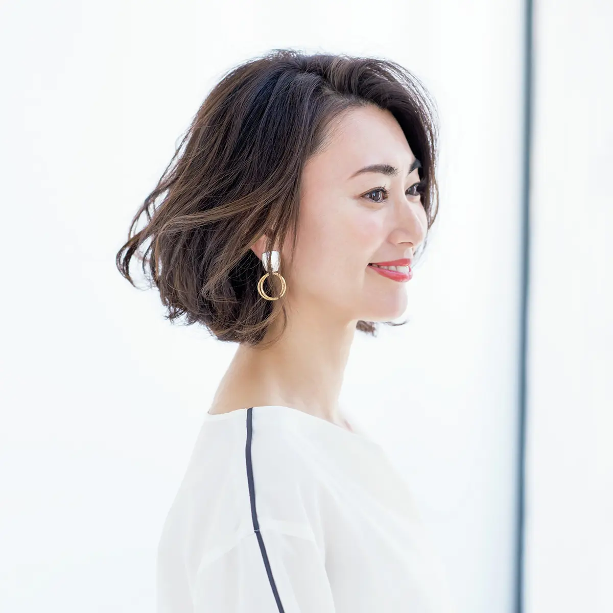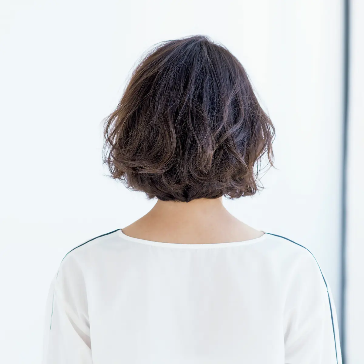 ボブだとカジュアルになりすぎない?という心配がある人におすすめする、華やかでエレガントなボブスタイル。全体に丸みの出るフォルムにカットを仕込み、毛先にはくせづけ程度の1カールのパーマを。顔まわりにレイヤーを入れて、かき上げた前髪やトップをふんわりさせることで短めのボブでも女性らしい雰囲気に。毛量はあるけれど、トップだけがつぶれやすいという髪悩みにも対応できる応用力の高さも魅力のひとつ。