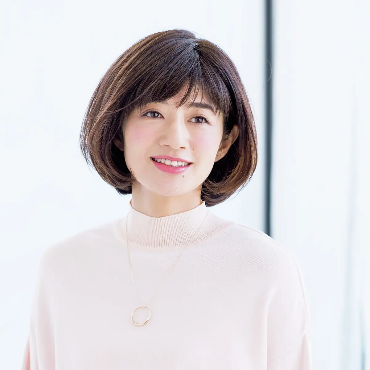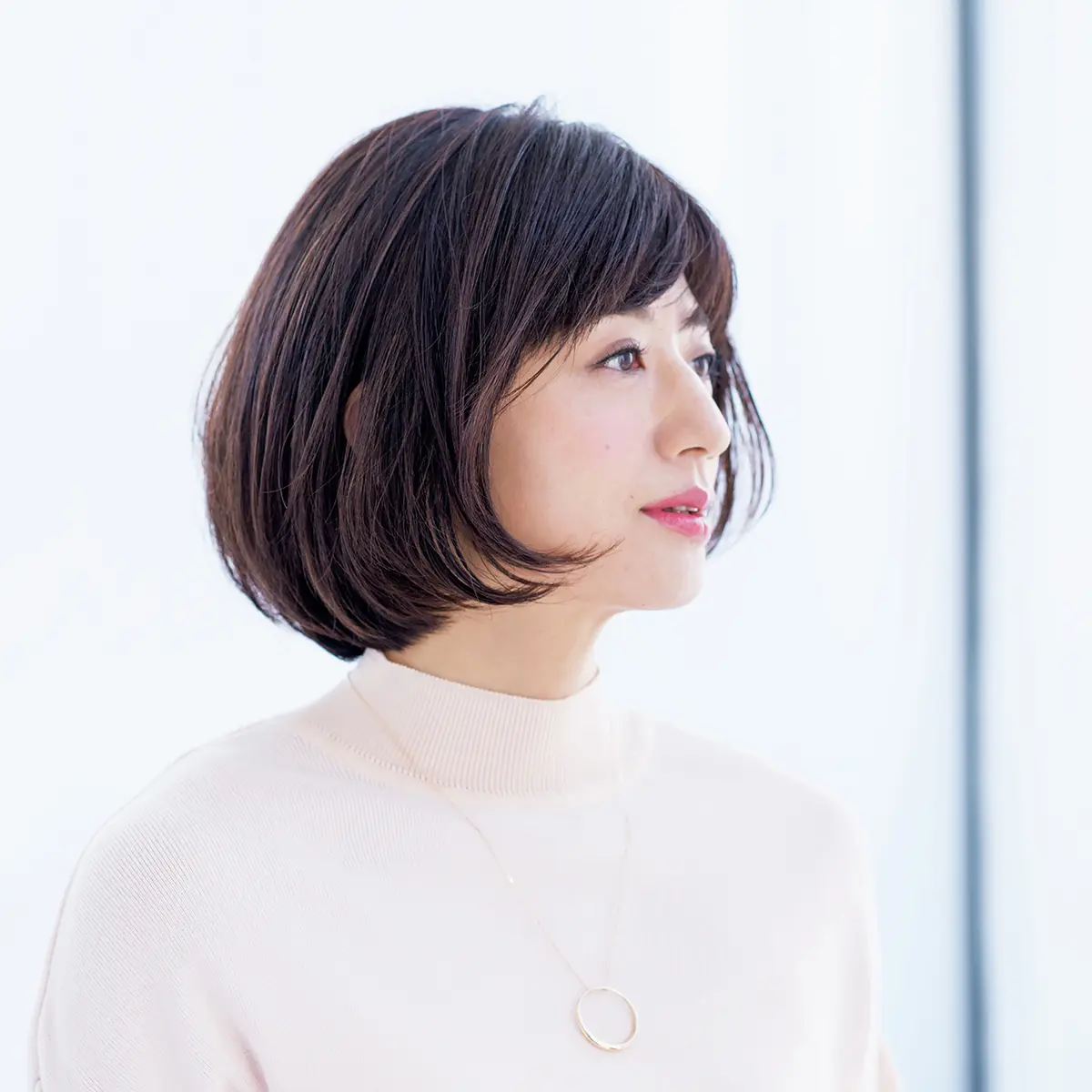 硬くて膨らみやすい髪質と、丸顔の両方をカバーできるボブは、首まわりに沿う毛先がポイントに。毛先を先細りになるようにカットするのがコツ。顔のラインをキュッと引き締め、髪全体のまとまりをよく見せる効果が。さらにややアシンメトリーな斜め前髪も小顔効果を発揮してくれる。