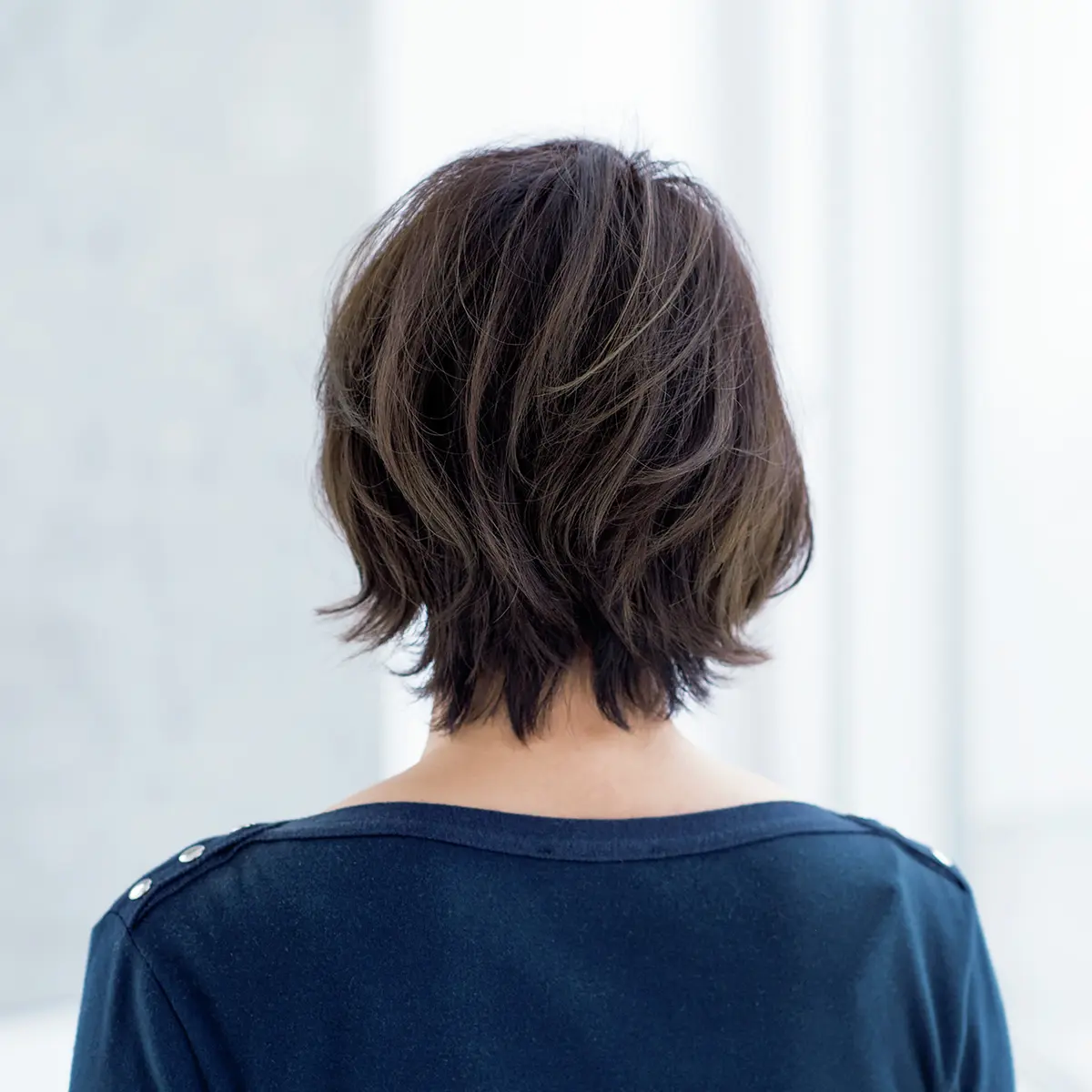 短めでも毛流れに表情がつきやすく、やわらかさもありアラフィーに人気のショートボブ。顔まわりの毛先の"角"をとるようにカットすることで、長め前髪を流したときに揺れ感が生まれ、さらに女性らしさがプラスされる。トレンドでもある長めの襟足を残して、カジュアルな中にも春のファッションとのバランスを計算している。部分的にハイライトカラーを混ぜて、白髪をぼかしつつ、ショートヘアに自然な立体感を与えて。