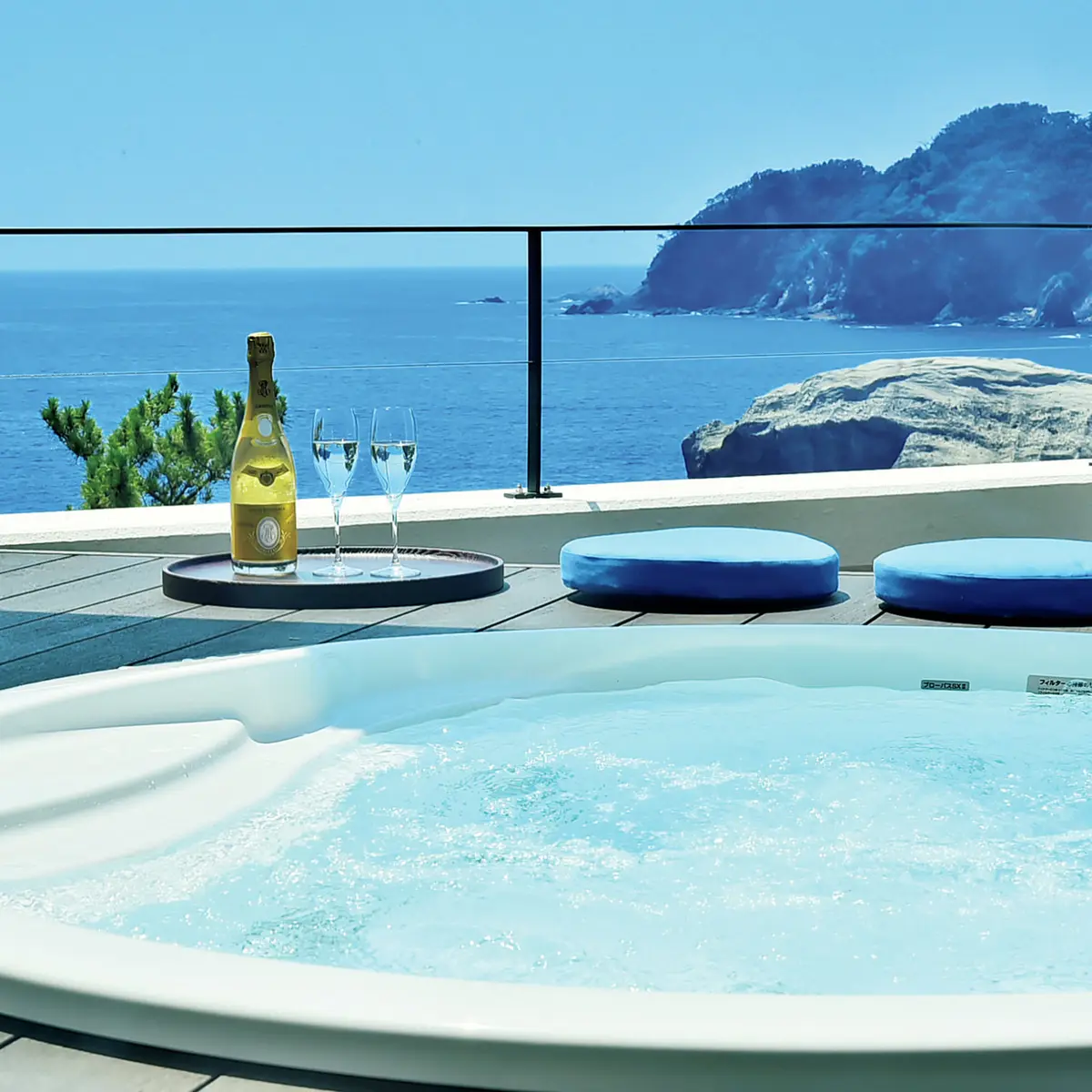 雄大な海と大地の自然景観で、ユネスコ世界ジオパークに認定されている伊豆半島。そのジオパークの絶景を堪能できる宿『繭二梁』が、昨年12月、西伊豆の堂ヶ島にオープンした。美しい小島が点在する風光明媚な海岸沿いに、角度を違えて、2つの棟が面しているユニークな造り。その2つの棟にある2つの部屋での滞在を、一度に楽しめるという、これまでにない贅沢な宿だ。海を眺める露天風呂つきのメインルームと、別棟にあるセカンドルームを合わせると、およそ150㎡という広さ。さらに、客室とは別に、露天ジャクジーを備えた部屋「プライベート・シエスタ」も有料で貸切利用できる。食事は、伊豆産の山海の厳選素材を用いた、目にも鮮やかな和食を提供。松崎町にも近く、西伊豆の海を、とびきり贅沢に味わえる宿だ。