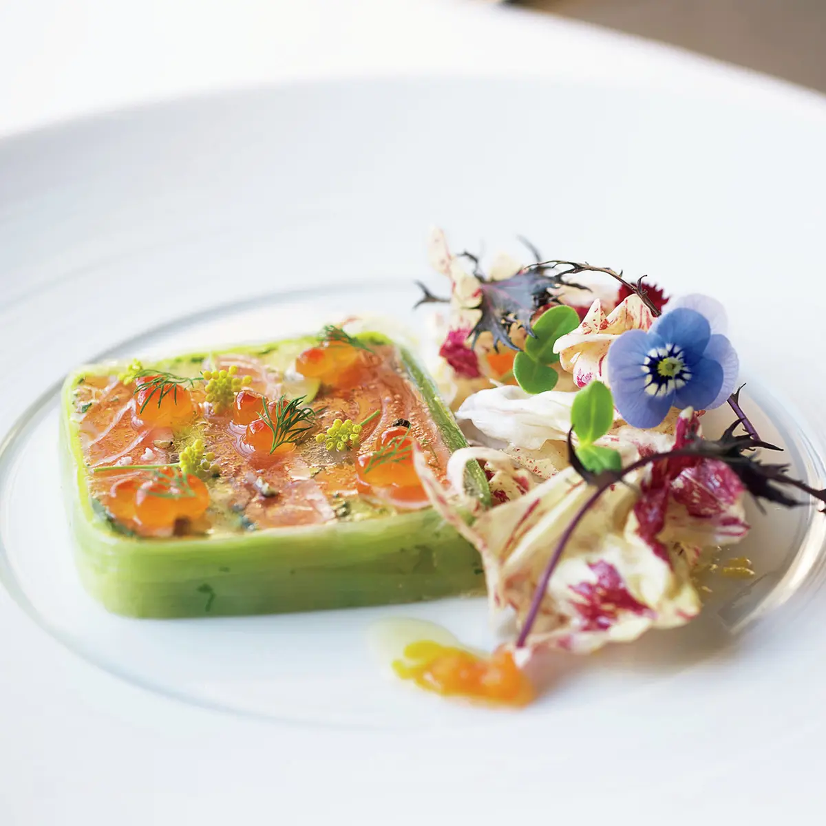 東京會舘を代表するフレンチレストラン『プルニエ』。名店『フウ』のシェフだった松本浩之氏を料理長に迎え、新しいスタイルのフレンチを目ざす。「『プルニエ』は開場当初、日本で初めての魚介専門のフランス料理店でした。私なりの現代的な解釈と技術を加え、原点回帰を目ざします」とシェフ。メニューには、松本シェフのモダンながら長年の経験に培われた完成された料理が並ぶ。岩塩でマリネし、グリルで半生に仕上げてサーモンのうま味を引き出した「サーモンのテリーヌ」、甘酸っぱいドレッシングで、ゆでたオマールの甘味を存分に味わえる「オマールのサラダ」。どれも軽やかながら風格を感じさせる料理だ。これから、肉と魚介を組み合わせた松本スタイルのお皿も登場。ますます期待できる一軒だ。