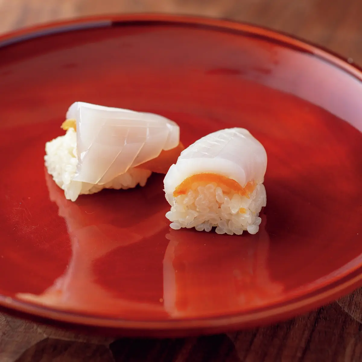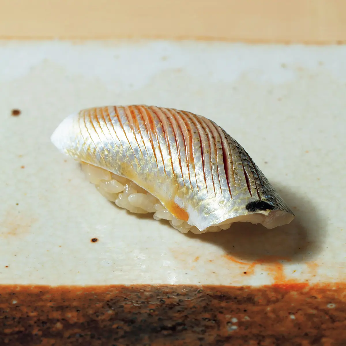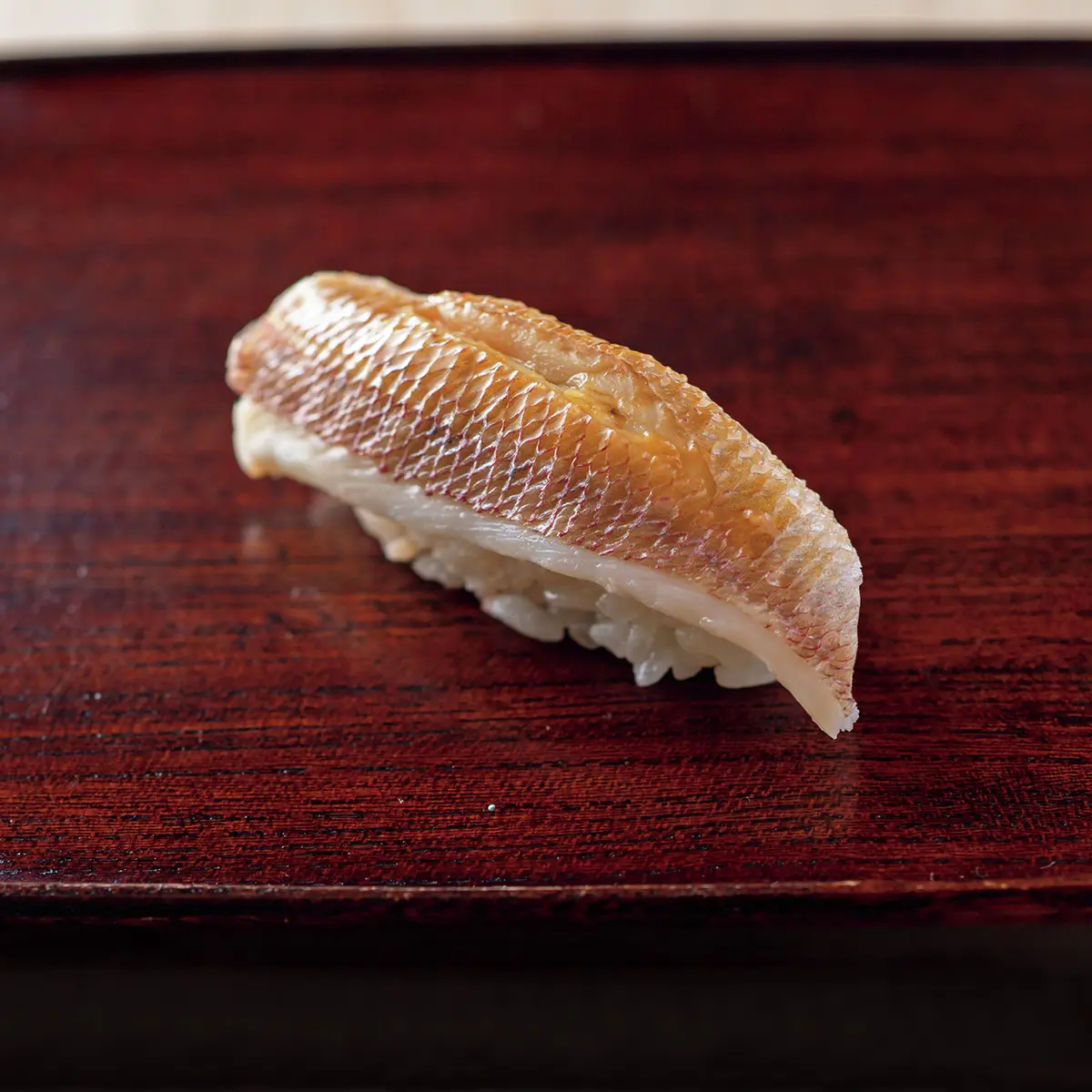 「にぎりの一貫目は春子(カスゴ)と決めています」と、尾崎淳さん。春子は鯛の稚魚の総称だが、身が軟らかい血鯛の稚魚を使用。軽い昆布締めで、みずみずしいうま味を存分に楽しませる。脂ののった高級魚は鮨の花形だが、「小さな魚に手間をかけて味をつくる」のが身上。長く修業した鎌倉『以ず美』で覚えた仕事だ。そんな職人気質のきまじめさは内に秘め、ゲストの前では徹底したエンターテイナーに。