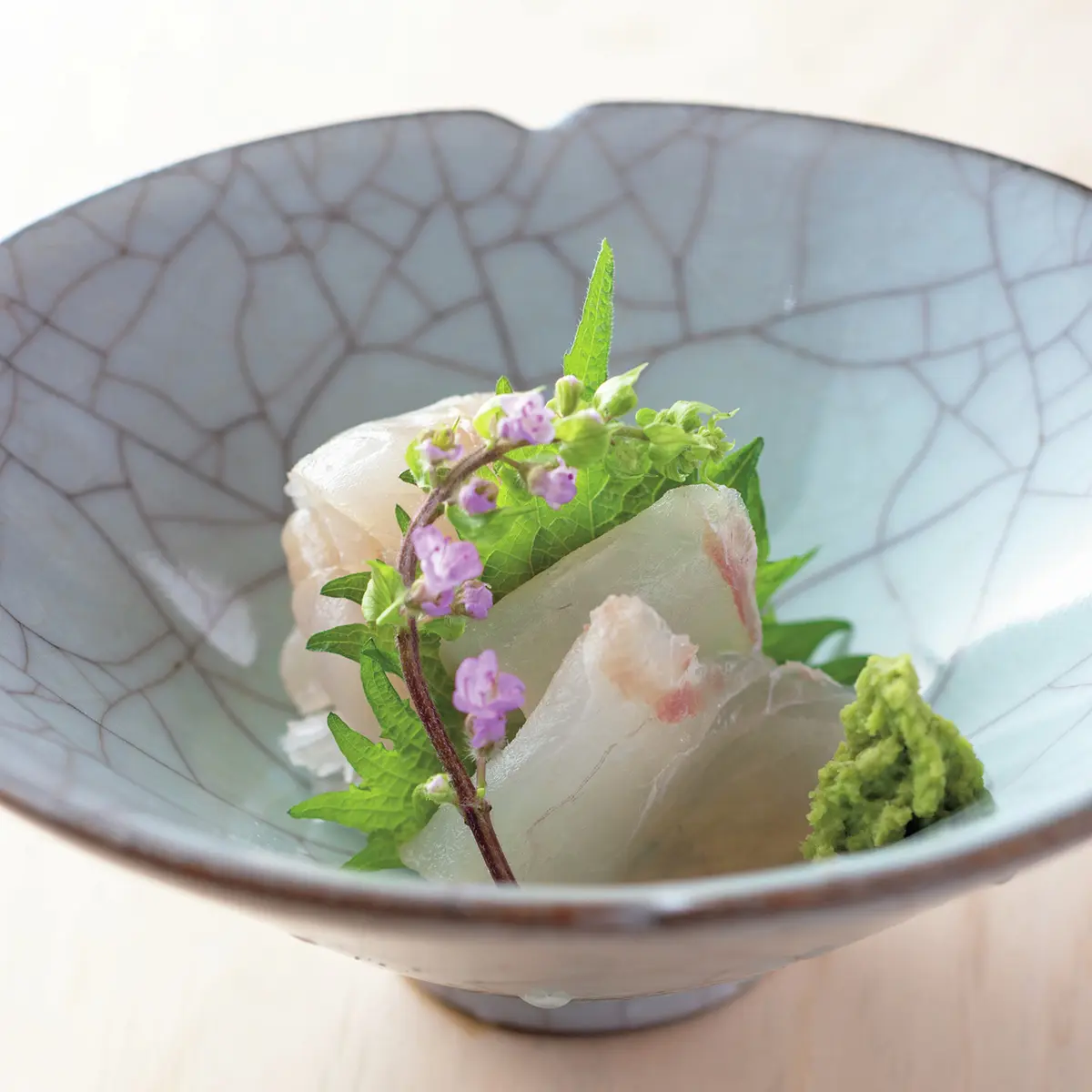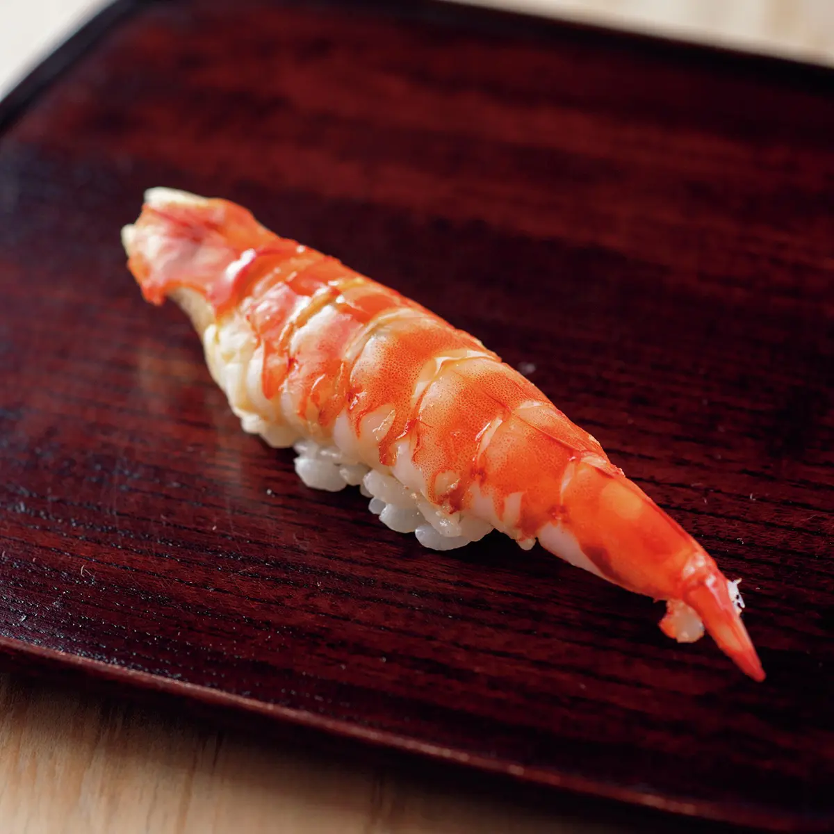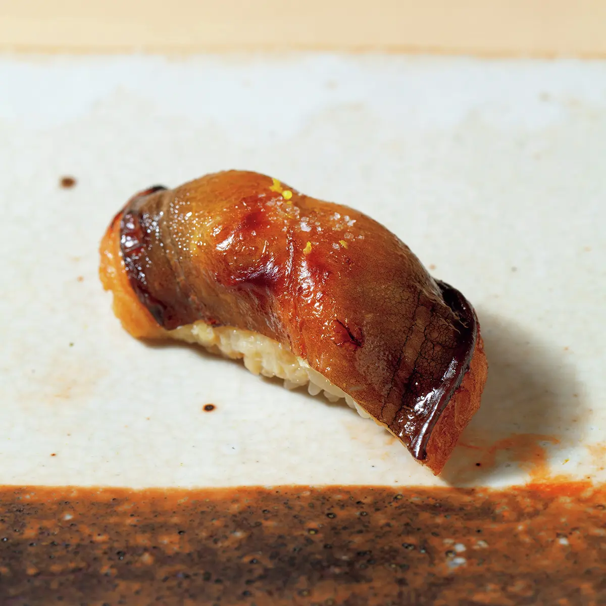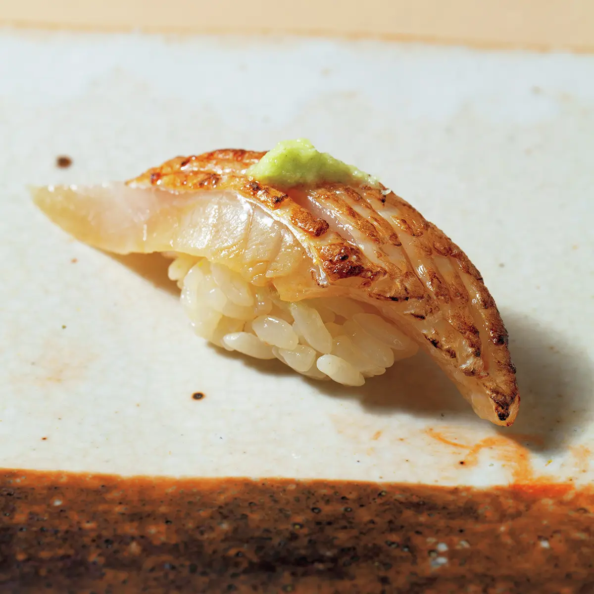 「にぎりの一貫目は春子(カスゴ)と決めています」と、尾崎淳さん。春子は鯛の稚魚の総称だが、身が軟らかい血鯛の稚魚を使用。軽い昆布締めで、みずみずしいうま味を存分に楽しませる。脂ののった高級魚は鮨の花形だが、「小さな魚に手間をかけて味をつくる」のが身上。長く修業した鎌倉『以ず美』で覚えた仕事だ。そんな職人気質のきまじめさは内に秘め、ゲストの前では徹底したエンターテイナーに。