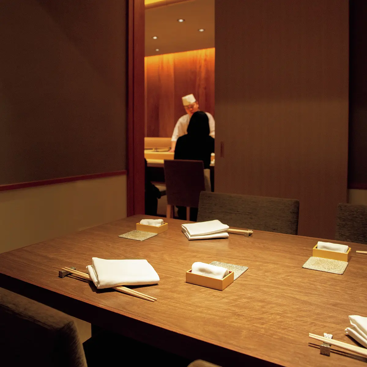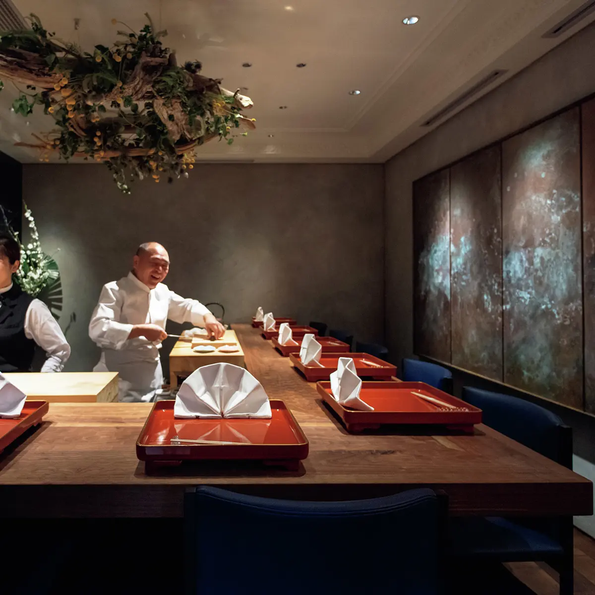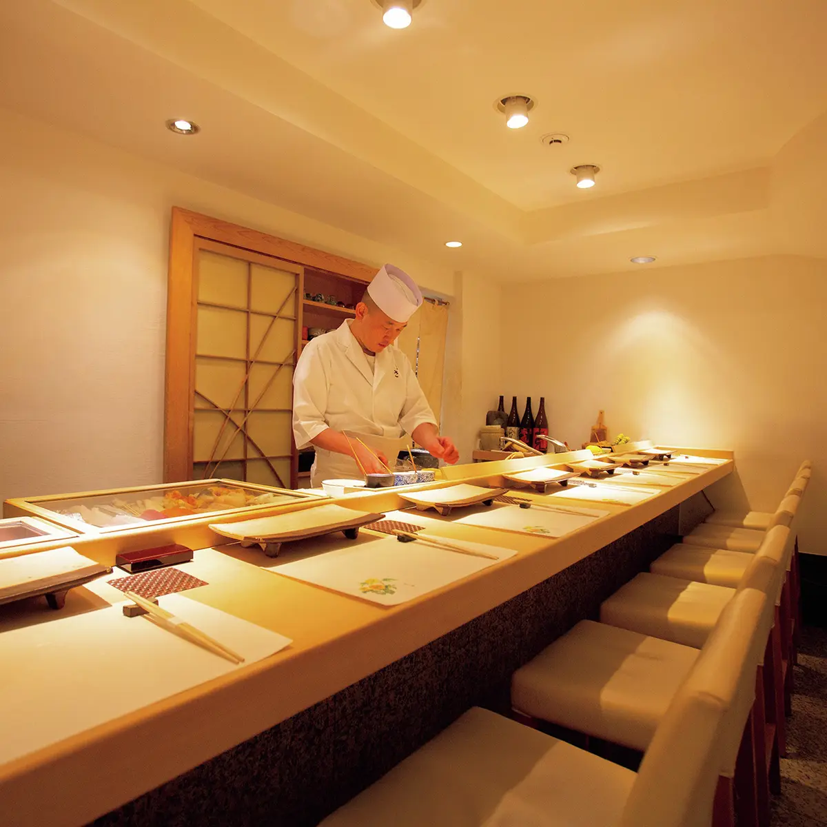カウンターはウォールナット材のL字形。インテリアは鮨屋らしからぬモダンさである。大将の中治勝さんが登場しゲストの前で酢めしをきり終えると、超豪華素材のオンパレード、「初音劇場」の始まりだ。