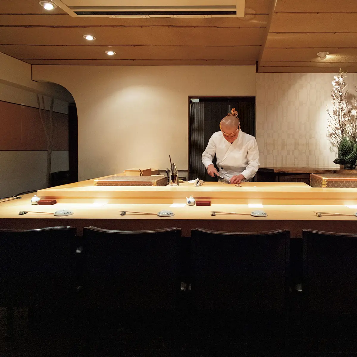 毎日営業直前に剃り上げるピカピカの坊主頭に、エルメスのスカーフのねじり鉢巻き。カウンターにはルイ・ヴィトンのネタケースが鎮座する。ムードはかなりイケイケだが、店主の安田尚充さんは16歳から自由が丘『鮨幸』一軒で14年間もの長きにわたり修業。親方も公認の独立時からのゲストに愛され続け、「お陰さまで、開業から8年、毎日満席です」と、話す笑顔はすこぶるさわやかだ。