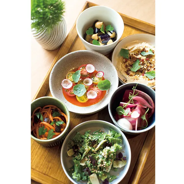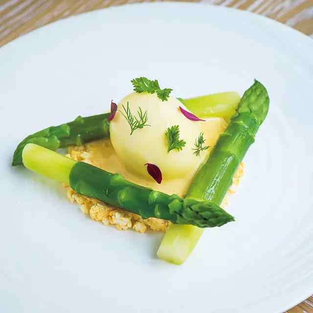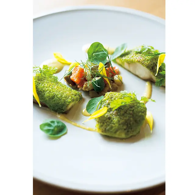 料理は入江誠シェフ。『ピエール・ガニェール・ア・東京』で料理長として二ツ星を獲得した実力を発揮しつつ、フレンチの枠から飛び出し、食材をのびやかな味わいに仕立てる。大切にしていることは、日本各地の食材の生産者をめぐり、「食材のおいしさを引き出すこと」。だから素材の魅力を十分に理解し、素直においしいとおなかの底から感じられる味に仕立てられるのだろう。今のところ、週末のランチだけの営業。緑豊かなテラス席もあるので、この季節におすすめだ。