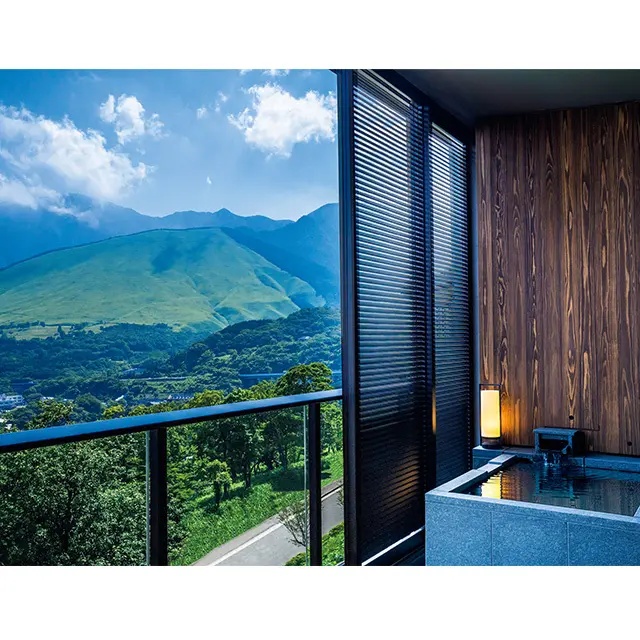 自然と一体化するような内装デザインで、九州地方で活躍する若手アーティストや熟練の工芸家などによるアートや工芸品が取り入れられている。こだわりの露天風呂は、別府石を用いた美しさ。国内で唯一、タイの高級スパブランド「HARNN」の施術を受けられるのも楽しみ。