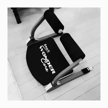 (上)バランスボールは食事中以外は椅子がわりに。内転筋を鍛える「レッグマジック」は加圧ベルトを脚に締めて実践。(右)姿勢を改善する「ストレッチポール」類。(左)腹筋器具「ワンダーコア」も腕に加圧ベルトを巻いて。「忙しいから"ながら" で効率よく鍛えるのが基本!」。