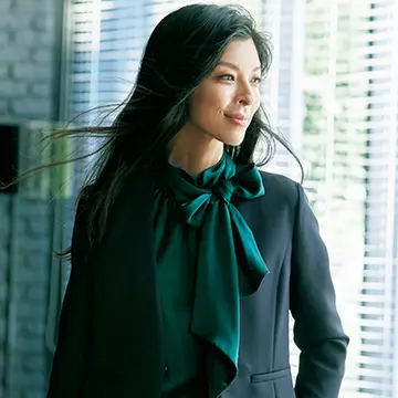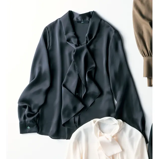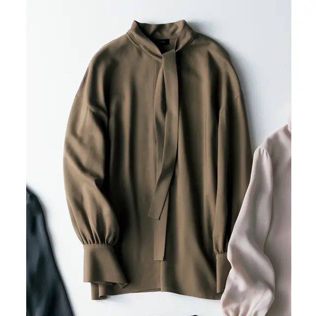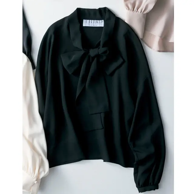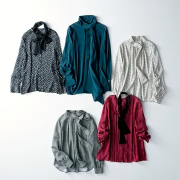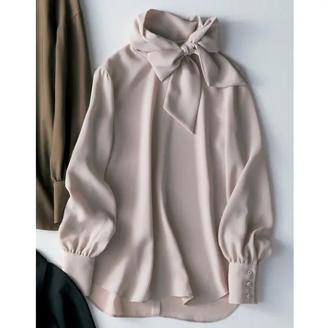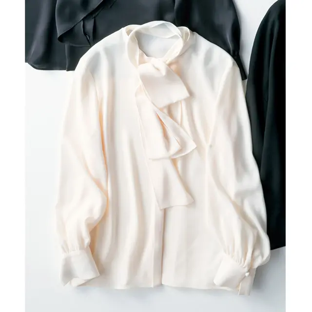 お仕事シーンにしっくりはまるボウタイブラウス、今シーズンは本当に豊作。その中から、さりげなく上品さを足す無地タイをセレクト。