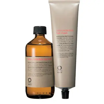 毛髪繊維を活性化して酸化を防ぐオーガニック・ゴジを配合。ダメージを防ぎながら、汚れをしっかり落とす。すすぎも簡単。オーガニックウェイ カラープロテクション(左)ヘアバス 240㎖ ¥3,400・(右)ヘアマスク 150㎖ ¥3,200/アラミック