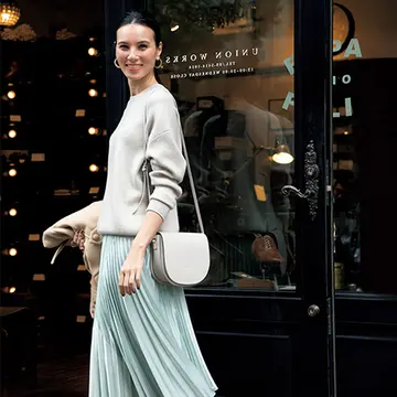 ニット¥44,000/ボウルズ(ハイク) スカート¥24,000/カオス新宿(カオス) サングラス¥39,000/アイヴァン PR(アイヴァン) ストール¥37,000/ジョン スメドレー銀座店(ジョンストンズ) バッグ¥89,000/J&M デヴィッドソン 青山店(J&M デヴィッドソン) 靴¥72,000/アルアバイル(ペリーコ)