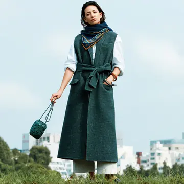 エクラ読者くらいのおしゃれさんなら、もう、ジレを着ることに抵抗を感じないのではと思って、5着の最初に選んだアイテムがこれ。どんな服にも似合う、メランジ調のロング丈。はおるだけで、間違いなく上級者見えする一着です。