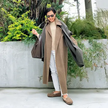 ブラウンとキャメルの王道グラデーション。ショートコートとマフラーは、アクネ ストゥディオズ。そこにThe Kooplesのグレイッシュパープルバッグがなじんでフェミニンさをプラス。かさばりやすい秋冬コーデに、斜めがけが実用的で躍動的な印象を与える。