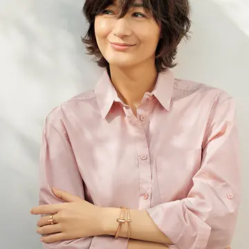 バングル「ピアジェ ローズ」(WG×D)¥2,266,000/ピアジェ コンタクトセンター(ピアジェ) ブラウス¥64,900/ドゥロワー 六本木店(ドゥロワー) バッグ¥39,600/プレインピープル青山(ドラゴン)