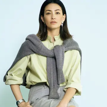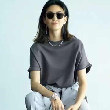 「ほのかに甘いくすみピンクを重ねたスタイリングと、燻(いぶ)されたようなシルバーチェーンは絶妙に合います。シルバーは、レイヤードした襟もとにはあしらわず、耳もとにさりげなく。あとは手もとだけで十分に素敵」とスタイリストの村山佳世子さん。ハムのシルバーをポイントに効かせたコーデを提案。