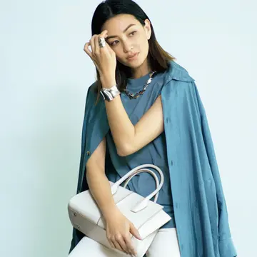 ヴィンテージローズを重ねた着こなしに加えたのは、ハンドメイドで一点一点製作される定番シリーズ「ハムエタ」。強さの中にもどこか女性らしさが匂いたつアンティークのような風合いのシルバーチェーンが、キリッと引き締め役になって。