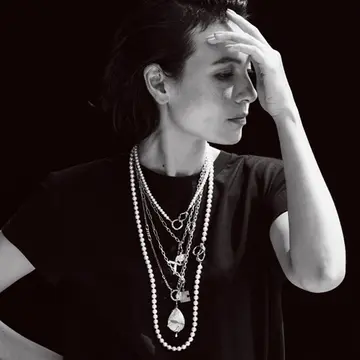 シャンバラの天然石ジュエリーも大胆に重ねづけしたら、シックなランバンのブラックドレスがアクティブな印象に。「かつてはジュエリーをつけ替えていましたが、最近はお気に入りをつけっぱなし。まさに自分の一部です」。