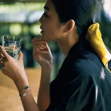豊かなロングヘアとジュエリーを風になびかせ、女性らしさを謳歌する姿はさすが元モデル。自身が手がけるI’M JEWELのピアスは左右でミスマッチさせて。