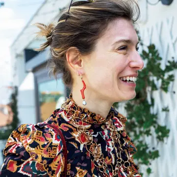 色鮮やかなサマードレスを主役に、ボリュームのさじかげんが光るネックレスのレイヤードスタイル。夫から贈られたという華奢なネックレスは肌の一部としてタイトにつけ、イーブルアイ風のペンダントはアクセントに。長めのチェーンネックレスで胸もとに輪郭をプラス。単体では控えめなアイテムも洒脱に。