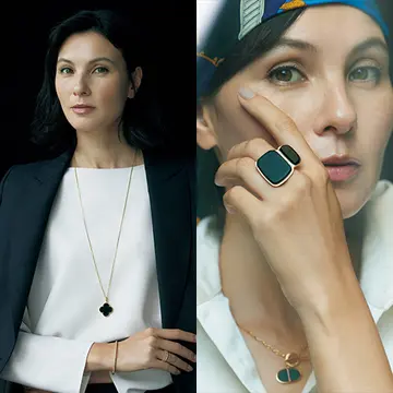 シャネルのファイン ジュエリーの大胆な創造性を象徴するセラミックが、ダイヤモンドとともにグラフィカルな曲線を描くリングとブレスレット。ストールやニットなど秋冬に欠かせない柔らかな素材にこそ、凛としたブラックセラミックのジュエリーが美しく映える。