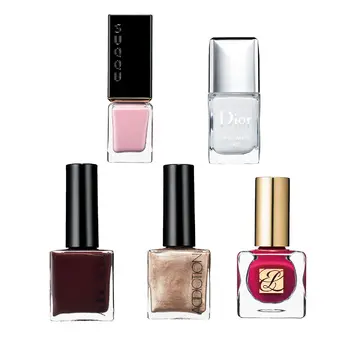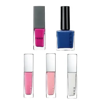 (右)RMK ネイルポリッシュ 09 ¥1,500・(中右)同 16 ¥1,500・(中)同 18 ¥1,500/RMK Division (中左)アディクション ザ ネイルポリッシュ Purple Rain S ¥1,800/アディクション ビューティ (左)THREE ネイルポリッシュ 57 ¥1,800/THREE