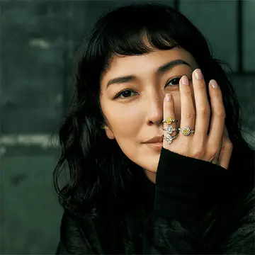 ホワイトとは違う、豊かな魅力をもつブラウンやブラックのダイヤモンドは、エクラ世代の日常にふさわしいしゃれ感が魅力。「サッビア」の長方形のリングは、不規則なパヴェセッティングでホワイトからブラウン、ブラックへとダイヤモンドをグラデーション状に配置。つややかなローズゴールドにブラウンダイヤモンドがセッティングされた「イコニカ」のバングルを重ねて、シックなカラーダイヤモンドを堪能して。