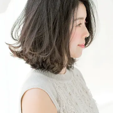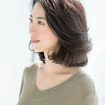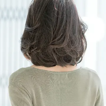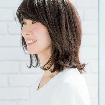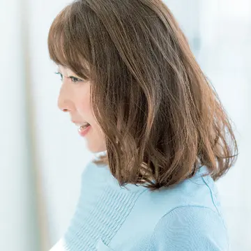 奥行きの深い前髪は毛量が気になる人や額が狭い人にぜひ。トップから中間はツヤ感を強調して重めに見せつつ、毛先はていねいに入れたレイヤーで動かして。パーマやアイロンで毛先の動きを加えれば、エフォートレスなミディアムに。